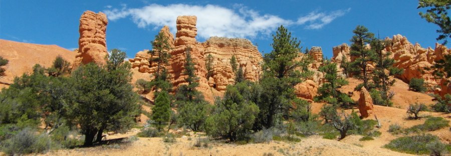 Langzaam komt Bryce Canyon dichterbij en voorbij het plaatsje Tropic zien we de eerste zogenaamde Rode Hoodoo’s. Het zijn een soort rotspilaren met opmerkelijke kleuren. Van oranje tot dieprood. Betoverd mooi.