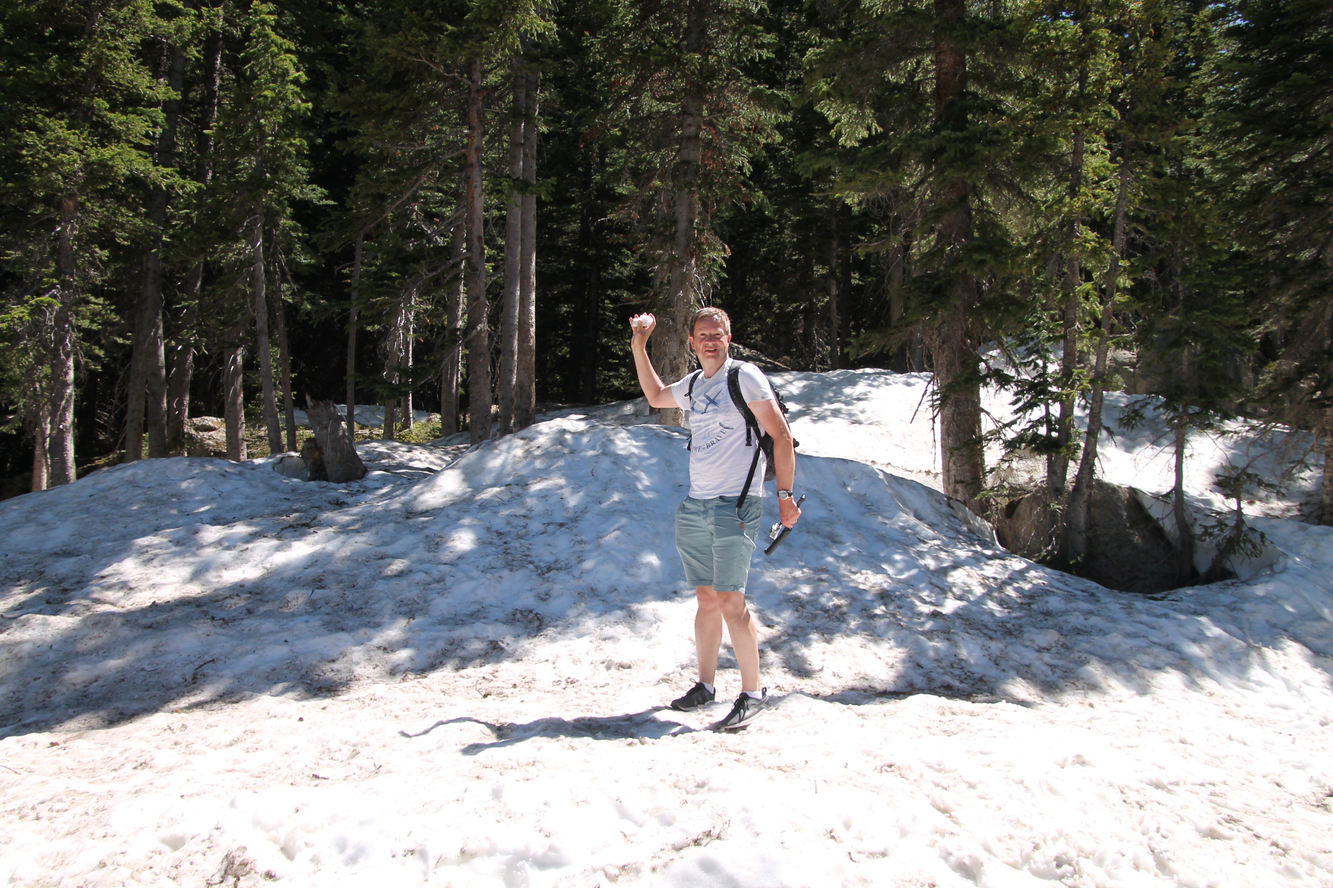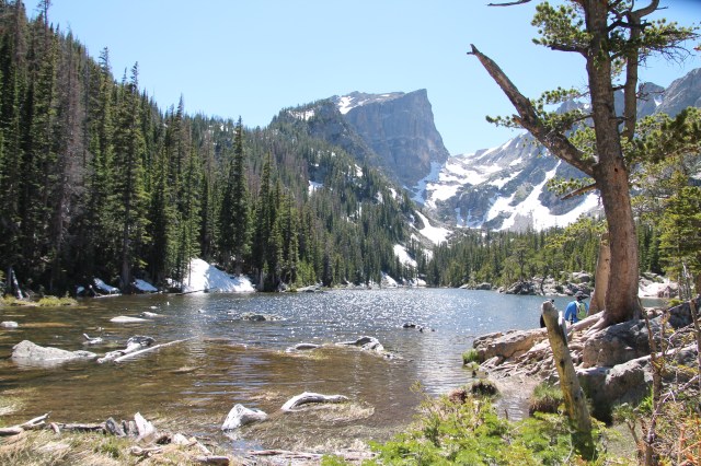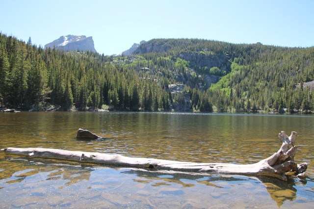 Bij Bear Lake aangekomen, konden we de auto gelukkig goed parkeren. We besluiten een trail te gaan lopen naar 2 meren …. Nimph Lake en Dream Lake. We starten vanaf het begin van de trail op een hoogte van 2888 meter en klimmen langzaam naar een hoogte van 3020 meter bij Dream Lake. Het is warm pfff en de zon op deze hoogte is erg fel. Insmeren is een must. Maar de trail is zo mooi dat we de warmte voor lief nemen. We hebben zoveel mooie plekjes gezien, over bruggetjes, door de sneeuw gelopen. Het was fantastisch! We hebben ruim 4.5 km gelopen en zijn 2 uur onderweg geweest. Terug gekomen nog even naar het Bear Lake gewandeld en dat was voldoende. Half 5 rijden we richting ons hotel in Estes Park.