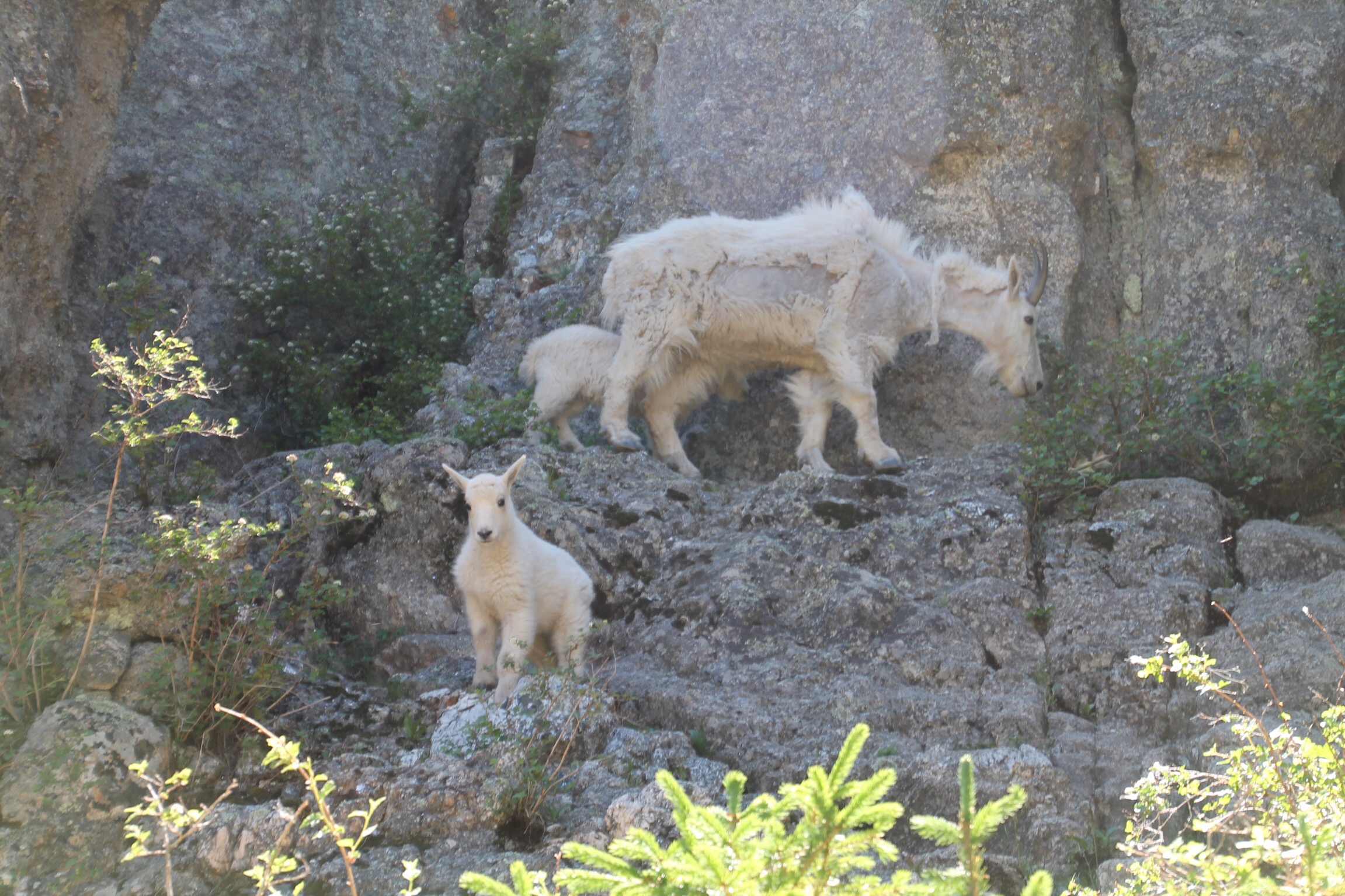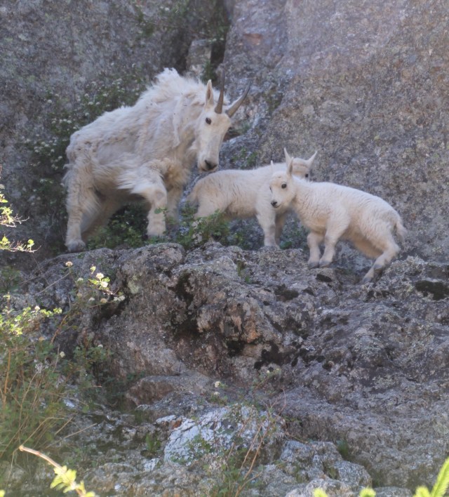 Bij een van de uitzichtpunten, lopen we een stukje off road. Hier komen we gezin tegen die ons tipt, dat er om de hoek dieren te zien zijn, met jongen. We begrepen niet wat voor dieren zij bedoelden, dus zelf maar even gaan kijken. Wauw …. wat speciaal …. berggeiten met jonkies!!!! Harry waagt het er op, klimt nog wat verder en maakt verschillende foto’s.