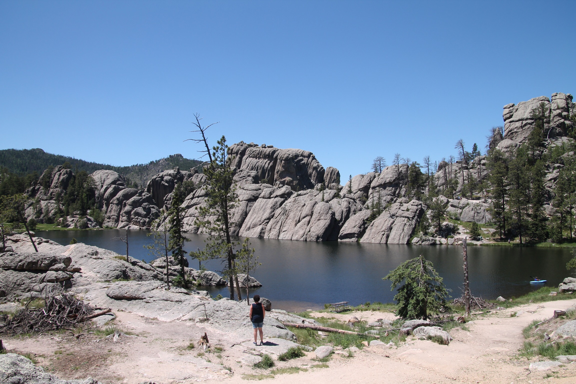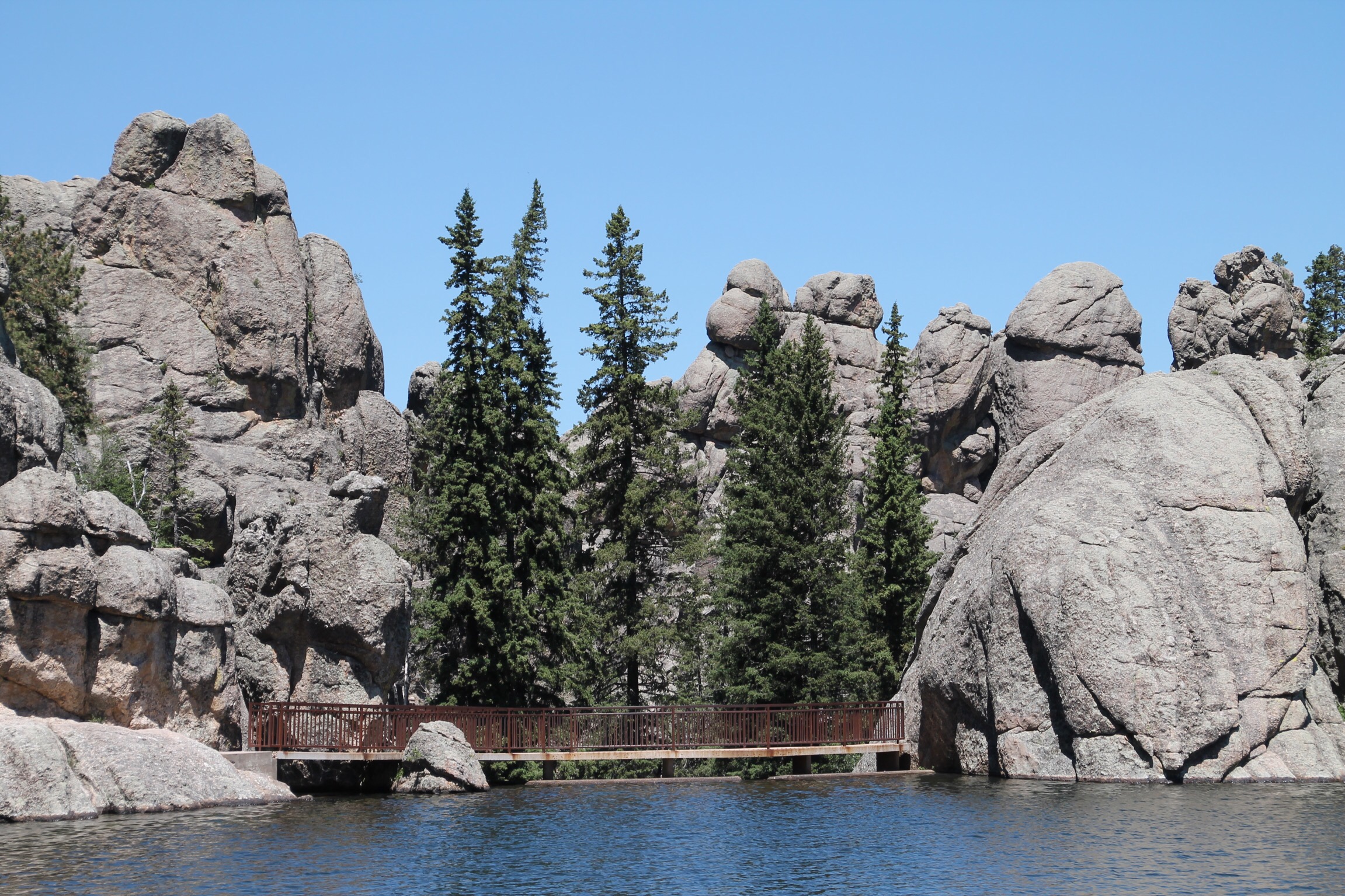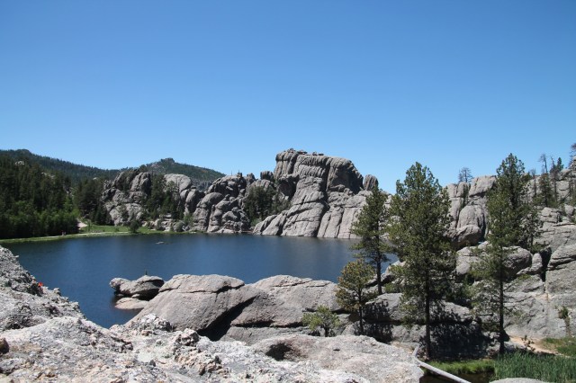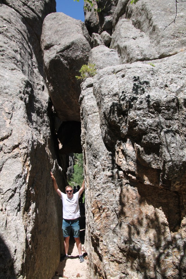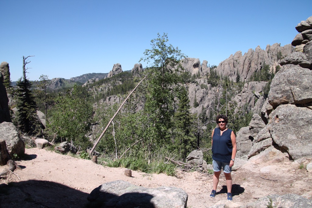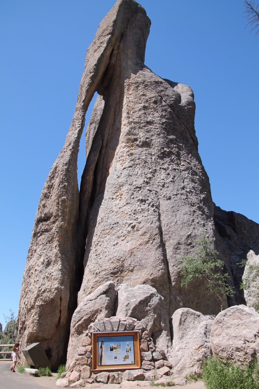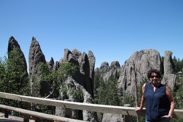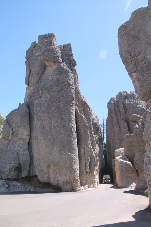 Daarna draaien we de Needles Highway op. Prachtige Scenic drive. In het begin is het nog niet heel spectaculair, maar later is het fantastisch. Best smalle weg en langs hoogtes rijdt je langs hoge, steile rotsformaties. Ze steken als naalden uit de grond, vandaar de naam Needles.