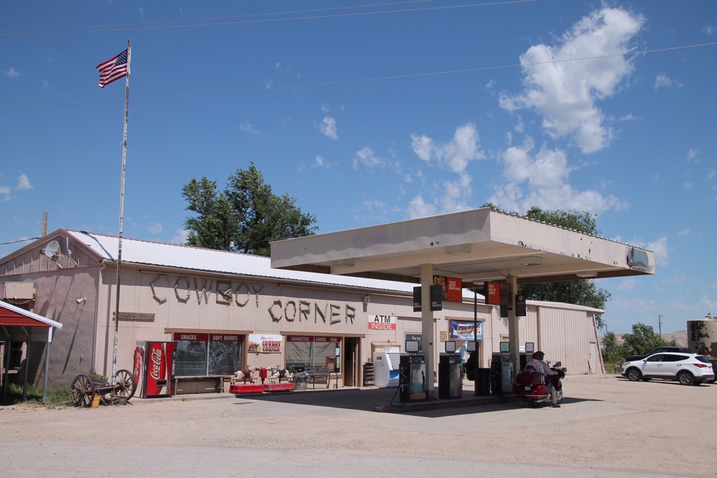 Onderweg nog even een benzinepomp aangedaan voor een sanitaire stop. We nemen een bekertje koffie mee, een snicker en kopen voor Harry een goedkope zonnebril. Zijn eigen zonnebril heeft ie waarschijnlijk bij Wall drug store achter gelaten. En al meezingend met Don McLean’s American Pie rijden we weer door.