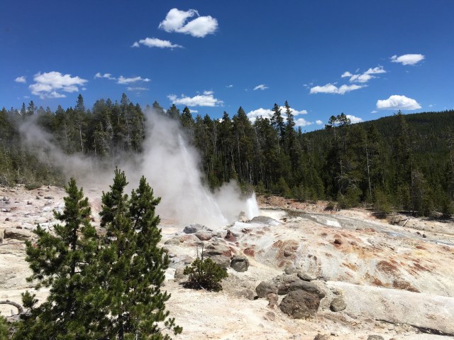 Kwart over 2 gaan we stuk rondom Back Basin lopen. We lopen tot de grootste geiser van Yellowstone. De steamboat geyser.