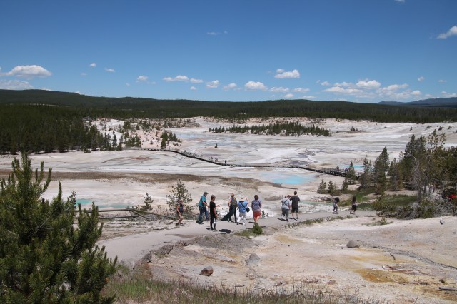 13.00 uur rondom Porcelain Basin gelopen. Een route van 1 km, met stomende geisers, borrelende pooltjes en andere mooie natuurverschijnselen.