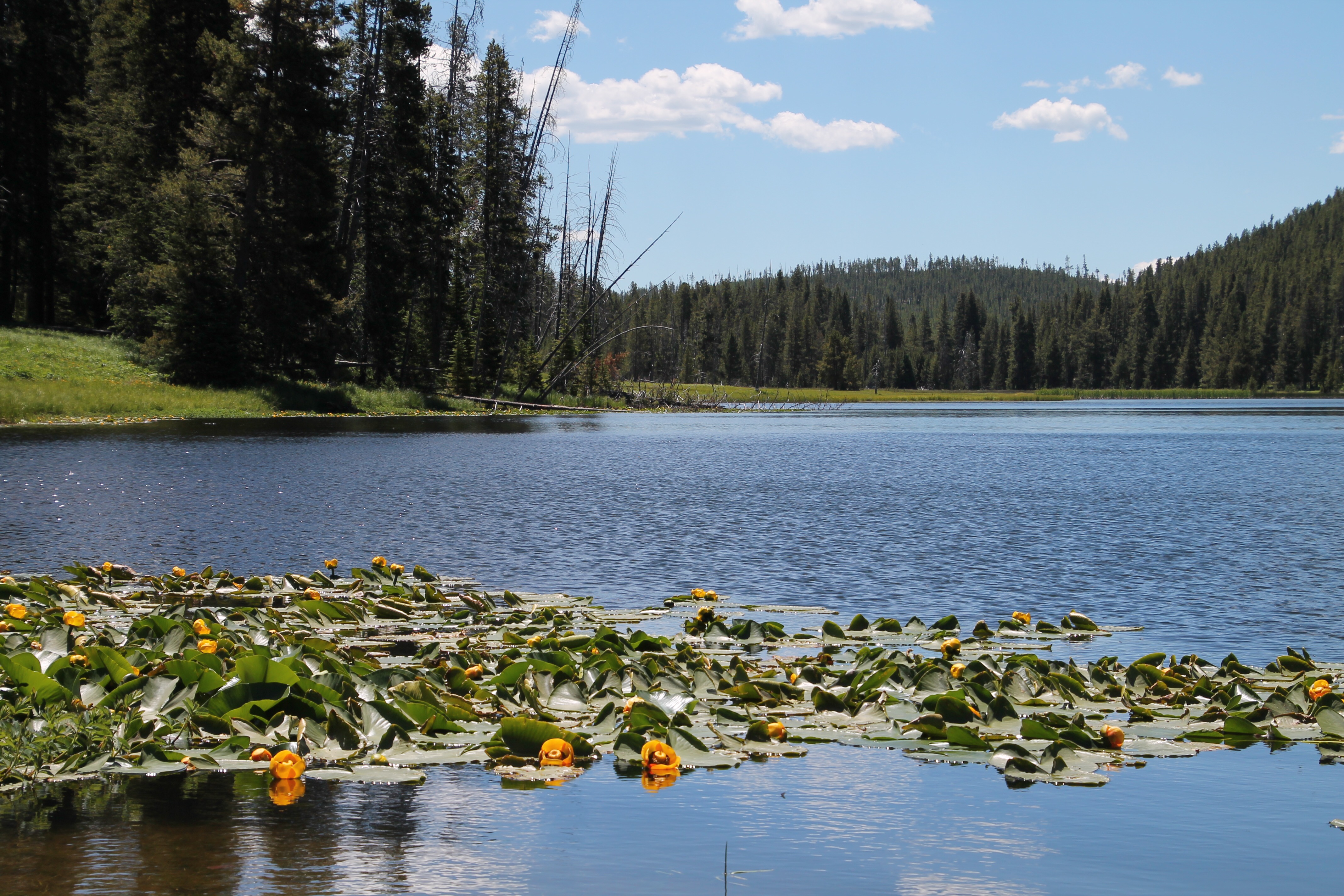 Later bij Twin Lake. Hier drijven bloeiende lelies op het water.