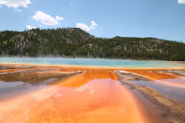 Om 12.35 komen we aan bij Midway Geyser Basin. Hier ligt de grootste warmwaterbron van het park en de 1 na grootste ter wereld, de Grand Pismatic Spring met een diameter van 100 meter. Ook hier is het heel druk, maar na een kwartiertje hebben we toch een plekje gevonden.