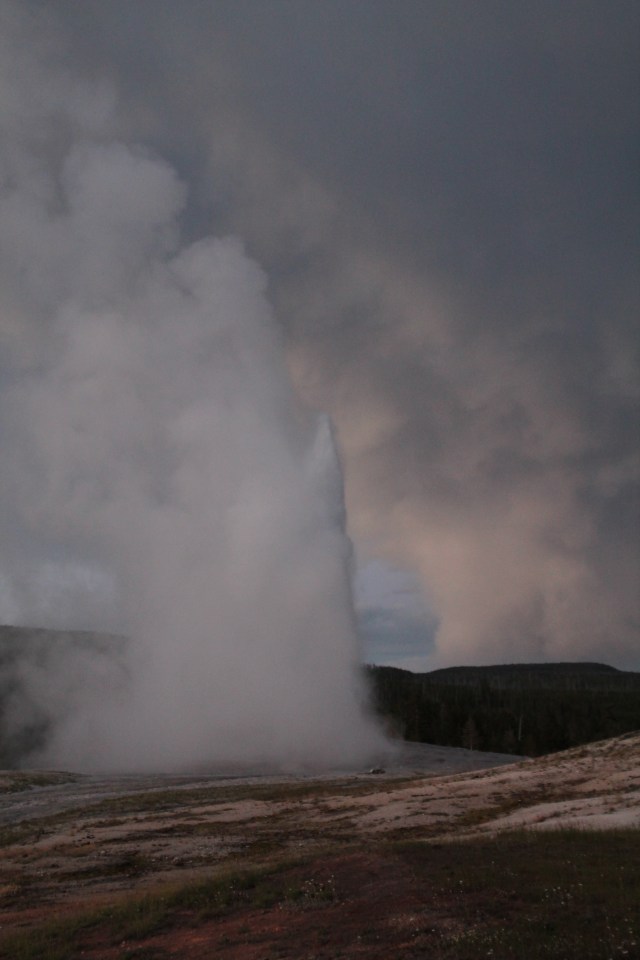 Hier is een koffiebar en we nemen een cappuccino met een plak cake, die we delen. Rond 21.10 uur lopen we naar de Old Faithful Geyser. Deze geiser is de bekendste geiser van de Verenigde Staten en zelfs van de hele wereld. Elke 1,5 uur is de uitbarsting te bewonderen die 2-5 minuten duurt. De straal bereikt een hoogte van tussen de 30 en 55 meter. Vanaf een houten vlonder met bankjes kan men deze geiser bekijken. Hij is erg regelmatig, vandaar de bijnaam Old Faithfull (Oude Getrouwe). 21.30 Uur wordt hij actief. Veel stoom en water tegen een al wat schemerige achtergrond. Een mooi schouwspel.