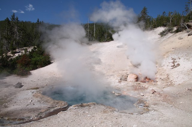 We stoppen even bij Beryl Spring. Dit is een van de heetste bronnen in Yellowstone, tussen de 87 en 89 graden.