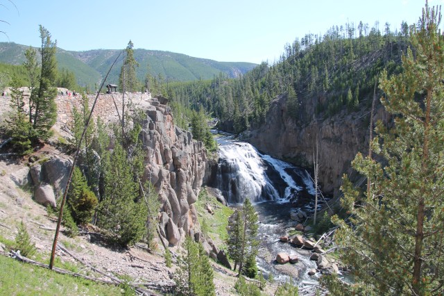 Iets over 10 komen we bij de Gibbon Falls. De watervallen zijn 26 meter hoog en sleuren bij hun tocht door de vallei talrijke dode bomen mee. Het is een mooie brede waterval. We lopen weer een stukje naar de overlooks en nemen uiteraard wat foto’s.