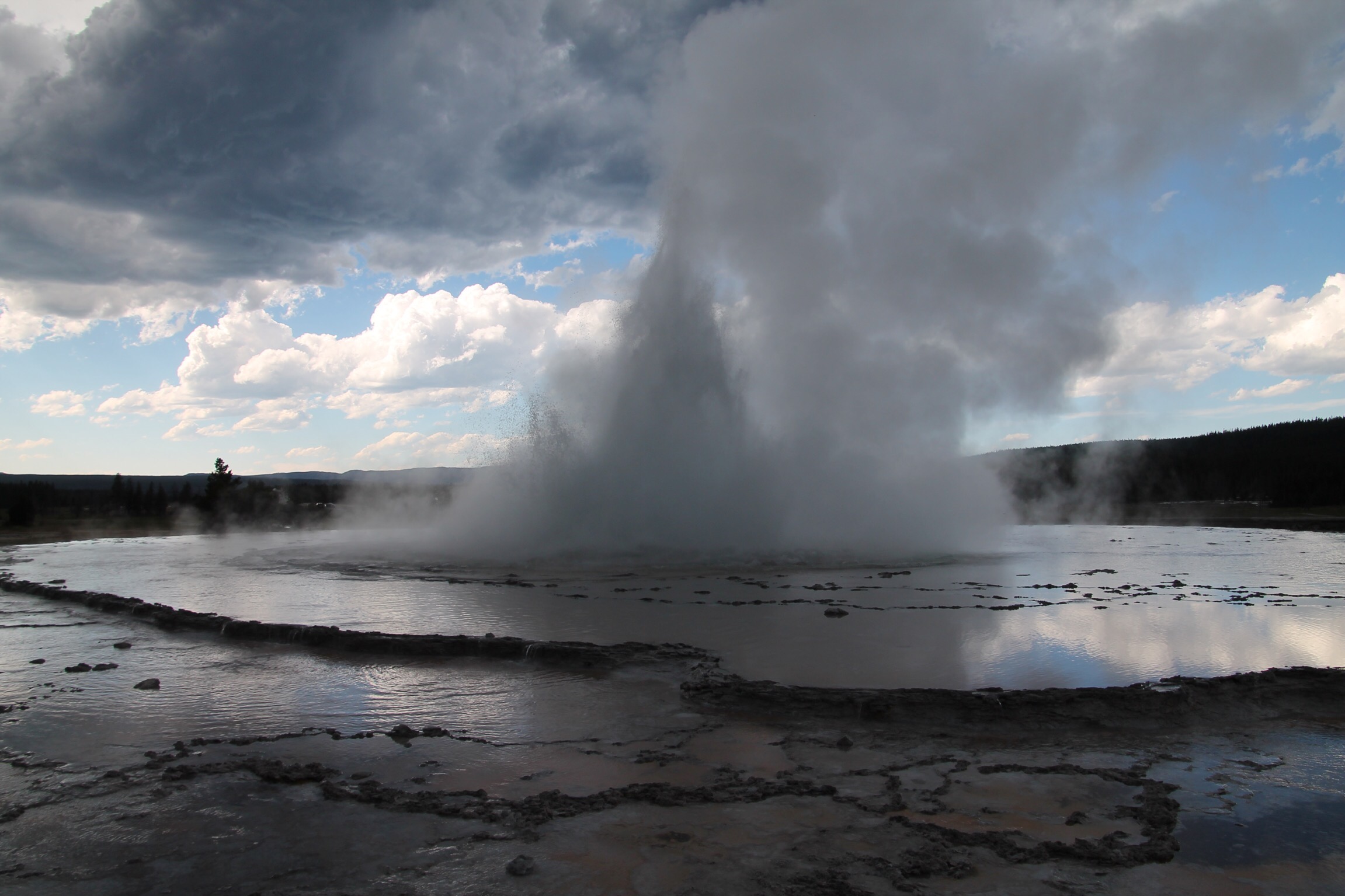 We gaan weer rijden, eerst gaan we nog naar Black Sand Basin. Hier weer geisers, oa de Cliffgeiser en wat heetwaterbronnen. Hier veel minder toeristen. Het begint inmiddels ook wat bewolkt te worden. Heerlijk voor ons, maar voor het foto maken wat minder. We besluiten Biscuit Basin over te slaan en door te rijden naar de Great Fountain Geyser. Hier zijn we eerder op de dag ook al geweest. Er stond vermeld dat de geyser tussen 16.30 en 20.30 in actie zou komen. Wij waren hier om 17.10 uur en hoefden maar 20 minuten te wachten voordat het spektakel losbarstte.
