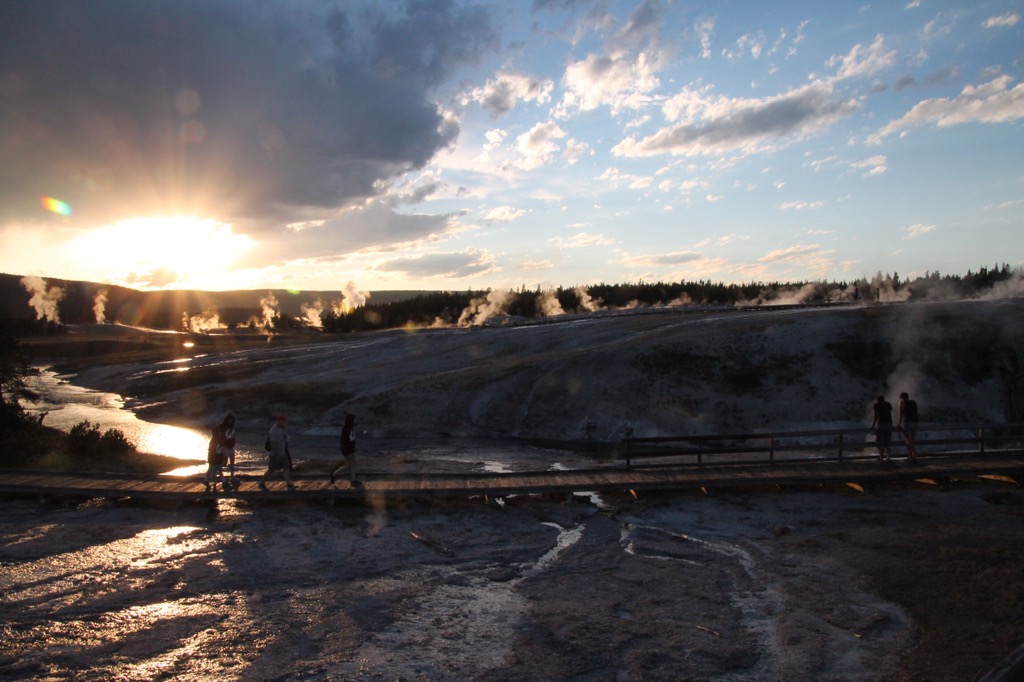 We lopen een stukje rondom de Old Faithfull geiser, waar nog meer kleine geisers, bronnen liggen. In de verte zie je overal stoom uit de grond komen van die geisers en bronnen.