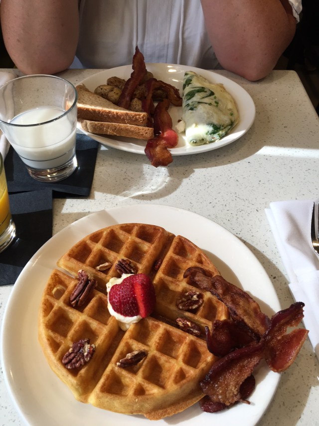 Vervolgens gaan we naar het vliegveld. Het is geen groot vliegveld. We nemen hier ons laatste American Breakfast. Harry gaat voor een wafle en Ingrid neemt scrambled eggs.