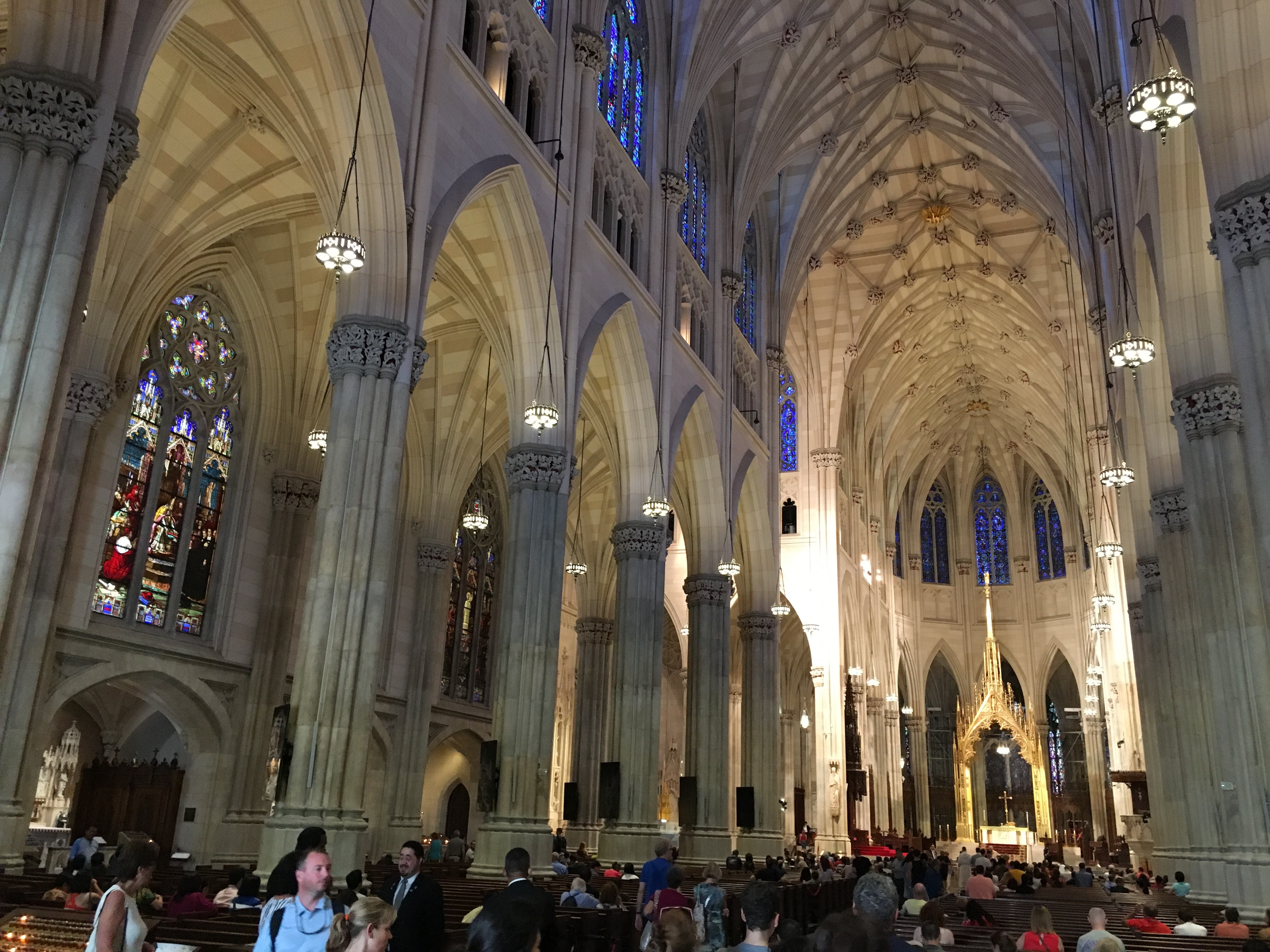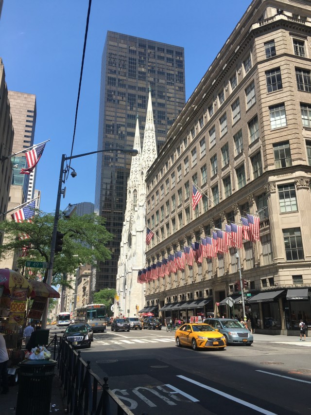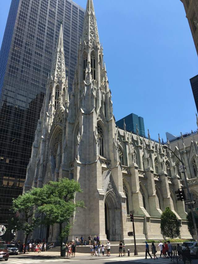 Bij Café Bene hebben we koffie gedronken. Daarna vervolgen we onze tocht naar Radio Music Hall en de prachtige St. Patricks Cathedral. Deze grote kerk ligt prachtig gelegen tussen de hoge gebouwen nabij Rockefeller Center. De toren van de kerk is 100 meter hoog.