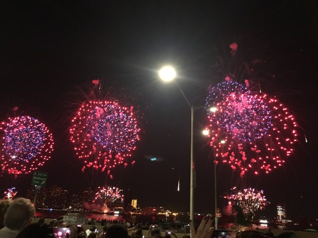 Omdat het 4 juli is, en dat betekend dat de Amerikanen hun onafhankelijk vieren, willen we het grote vuurwerk op de Hudson rivier bekijken. We besluiten alvast richting de rivier te lopen. Onderweg eten we bij Restaurant Mr.Biggs en daarna lopen we rond 20.00 naar het water. Maar dan blijkt als we daar aankomen dat het te vuurwerk aan de andere kant van New York is. We houden een taxi aan en gaan richting de East River. Als we daar uitstappen lopen we in een enorme mensenmassa richting de kant van de rivier. Alles word goed beveiligd door de politie. Om half 21.30 barst het vuurwerk geweld los. Een schitterend gezicht.