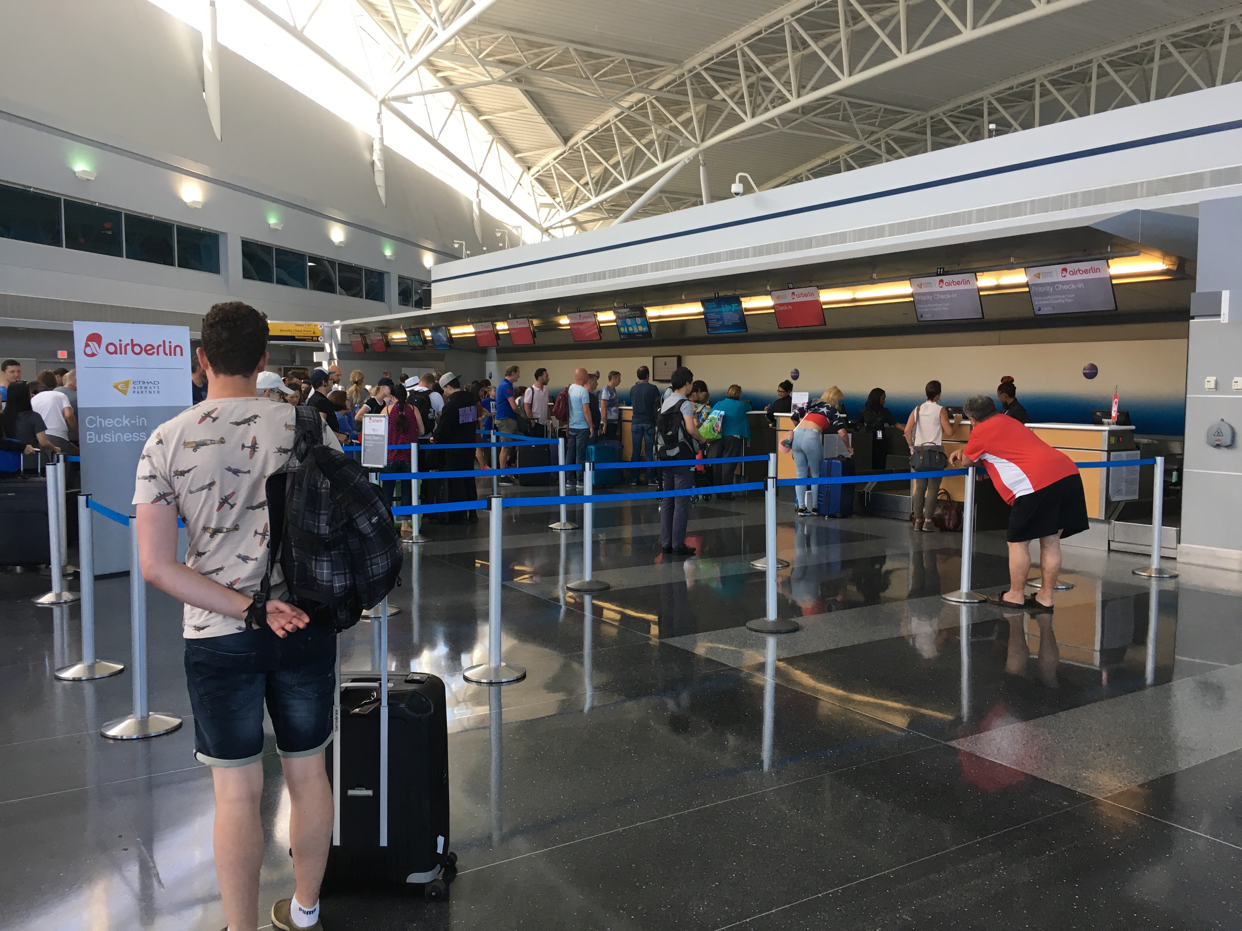 We checken in en zijn rond 16.15 uur door de douane en bagagecontrole. Om 18.35 zal onze vlucht naar Düsseldorf vertrekken. We eten nog een cheesecake en nemen nog wat te drinken en wachten tot we kunnen boarden.