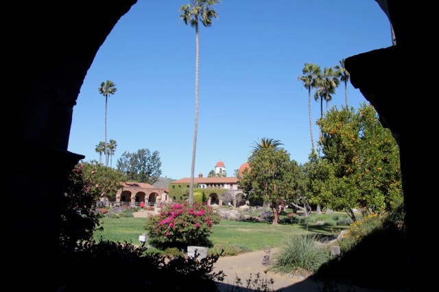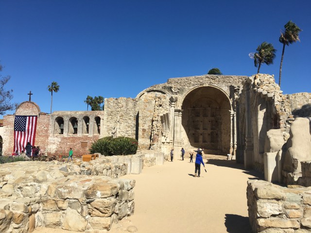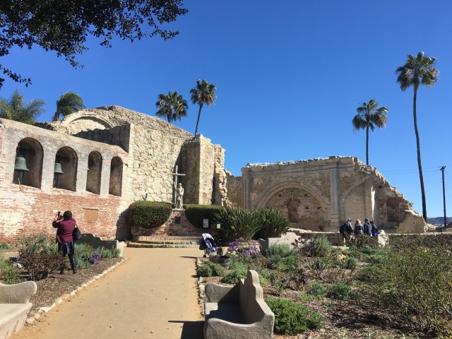 Harry heeft even bij de lobby wat ontbijtspulletjes opgehaald, die we op onze kamer lekker even opeten. We maken ons klaar en vertrekken om 9.00 uur. Het is een stuk frisser dan gisteren. Het waait harder en de temperatuur zal vandaag rond de 14 graden zijn. Onze eerste stop is na een half uur rijden bij missiepost San Juan de Capistrano. Deze missie is 1 van de bekendste missiekerken in Californië. Deze werd meer dan 200 jaar geleden gebouwd. Een deel van de kerk is al snel na de bouw door een aardbeving ingestort. We hebben er ruim een uur rond gelopen door de oude vertrekken en mooi aangelegde tuin, met o.a. cactussen, sinaasappel-, citroen- en olijfbomen.