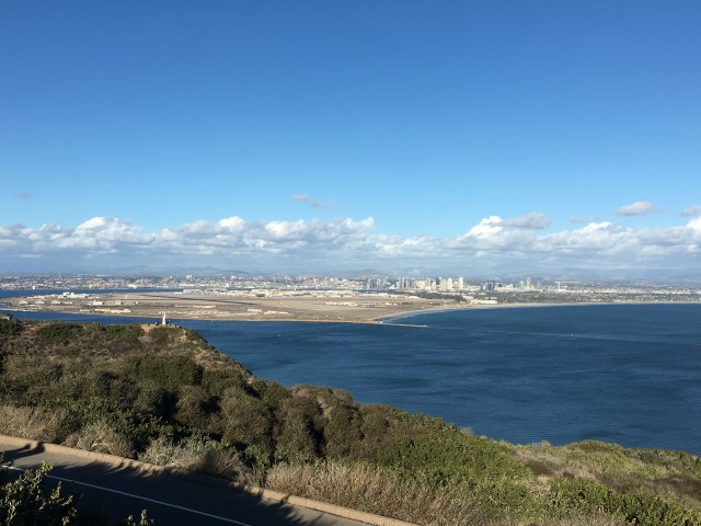 Het uitzicht vanaf de vuurtoren is mooi. In de verte zie je de skyline van San Diego.