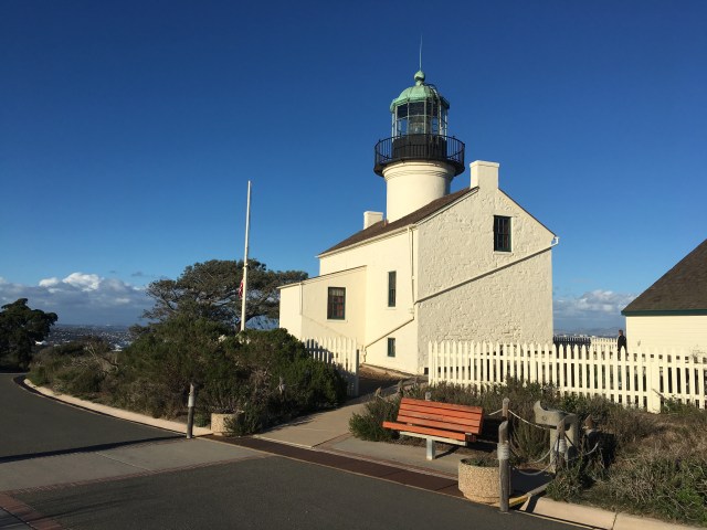 Om 15.00 uur verlaten we La Jolla en rijden door naar Point Loma. Point Loma is een heuvelachtig schiereiland bij San Diego. We komen aan bij het 58 ha grote park, Cabrillo National Monument. We betalen 15 dollar entree en parkeren de auto bij het Visitor Centre. Hier staat het Cabrillo Monument, opgericht ter ere van Juan Rodriguez Cabrillo, die in 1542 als eerste Europeaan de westkust van de VS betrad. We wandelen eerst naar de Old Point Loma Lighthouse. Een 14 meter hoge vuurtoren gebouwd in 1855. Nu is het een museum en kunnen we binnen een kijkje nemen. We zien hoe de vuurtorenwachter hier vroeger woonde.