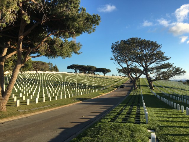 Het is 17.00 uur we verlaten het park en rijden nog even langs een immens grote begraafplaats, Fort Rosecrans National Cemetery. Hier liggen ca. 96.000 Amerikaanse militairen begraven, die o.a. in de tweede Wereldoorlog hebben gevochten.