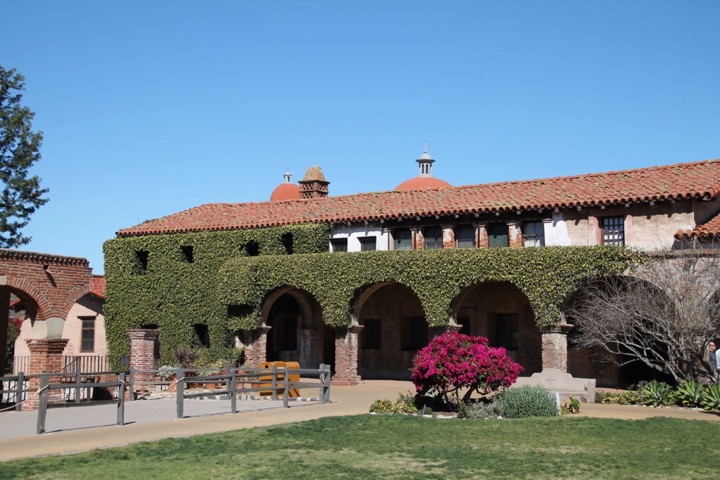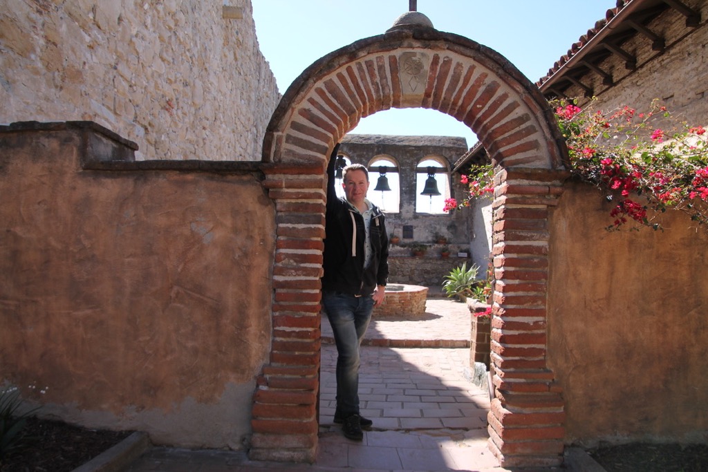 Harry heeft even bij de lobby wat ontbijtspulletjes opgehaald, die we op onze kamer lekker even opeten. We maken ons klaar en vertrekken om 9.00 uur. Het is een stuk frisser dan gisteren. Het waait harder en de temperatuur zal vandaag rond de 14 graden zijn. Onze eerste stop is na een half uur rijden bij missiepost San Juan de Capistrano. Deze missie is 1 van de bekendste missiekerken in Californië. Deze werd meer dan 200 jaar geleden gebouwd. Een deel van de kerk is al snel na de bouw door een aardbeving ingestort. We hebben er ruim een uur rond gelopen door de oude vertrekken en mooi aangelegde tuin, met o.a. cactussen, sinaasappel-, citroen- en olijfbomen.