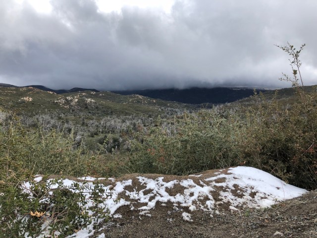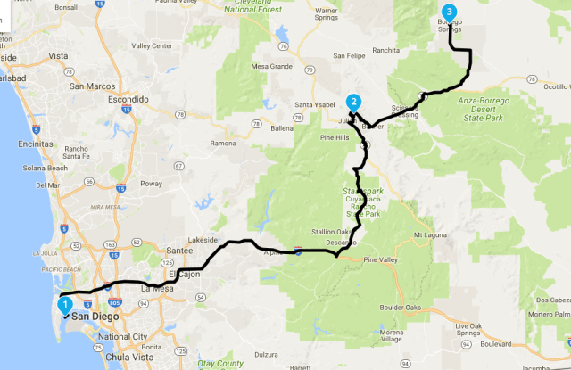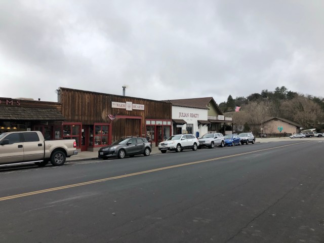 We verlaten San Diego via de Interstate 8 naar het oosten het binnenland in. Bij Alpine tanken we de auto bij. Via de Highway 79 gaan we de bergen in naar Julian. Onderweg hier naar toe gaan we hoger en hoger de bergen in en zien we zelfs wat verse sneeuw liggen.