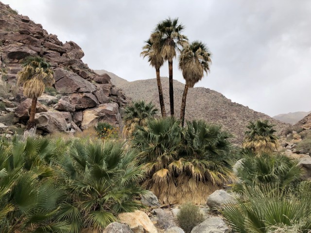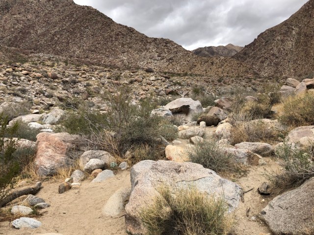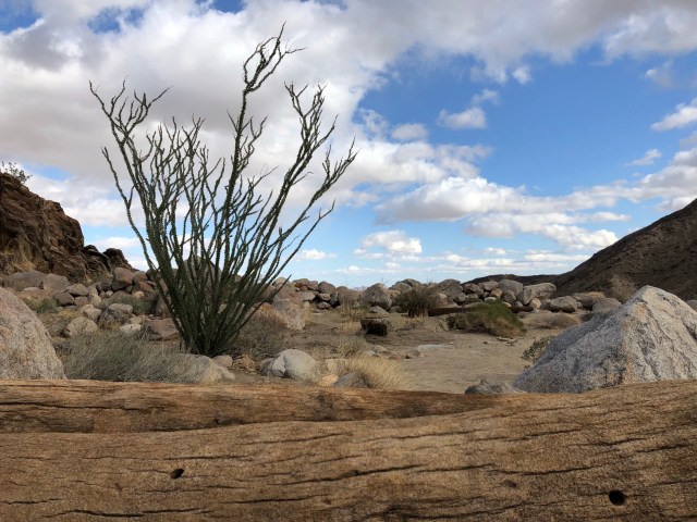 Dit woestijnachtig park is vernoemd naar de 18-eeuwse ontdekkingsreiziger, Juan Bautista de Anza en Borrego. Dit park is maar liefst 240.000 ha groot. Het hoogste punt in het park ligt op 1890 meter en het laagste op zeeniveau. In de zomer kan het er wel tot 50 graden heet worden. Vandaag bijna 16 graden. Goed weer voor een mooie wandeling. Bij het Visitor Center krijgen we info over de Palm Canyon Trail. Dit is een mooie wandeling die ons naar een prachtige oase voert met palmbomen. De wandeling (heen en terug) is ca. 5 km lang. De Palm Canyon is de op 2 na grootste palm oase van Californië. In het begin is de kloof nog breed, open en bedekt met grote en kleine keien met daartussen bloeiende struiken, cactussen en andere planten.