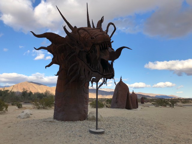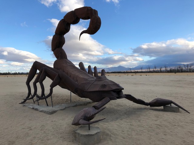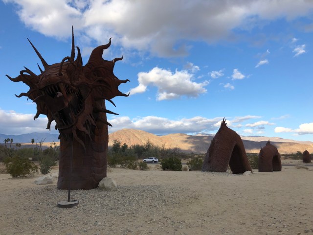 In Borrego Springs drinken we een bak koffie en daarna rijden we met de auto een route langs diverse ijzeren beelden van dieren die her en der in het woestijnachtige landschap staan. Van een paar maken we een foto.