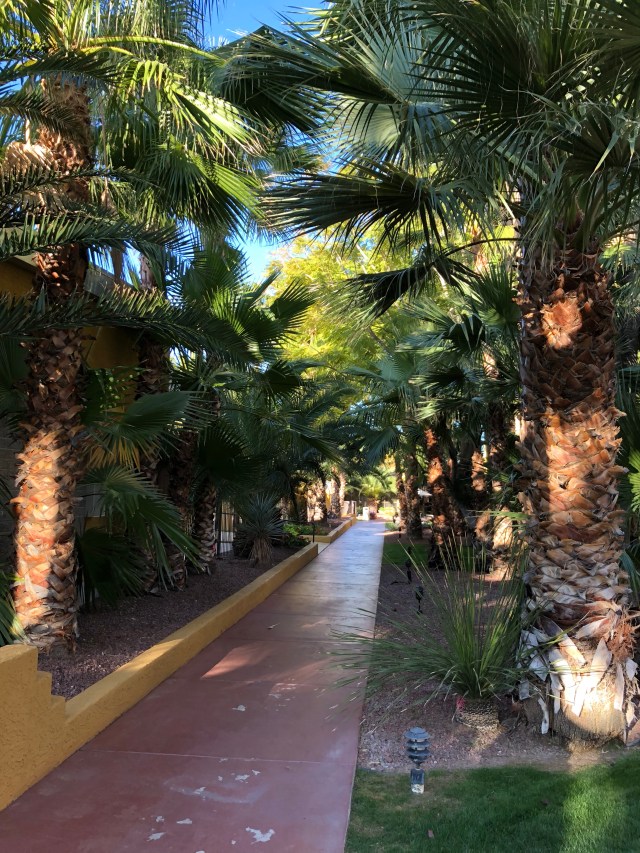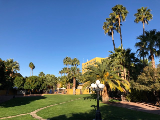 Vanochtend een uurtje later wakker. Buiten een strak heldere blauwe hemel, maar het is nog wel fris. Bij het hotel is een prachtige tuin met palmbomen, mandarijn- en sinaasappelbomen. Dat levert mooie plaatjes op.