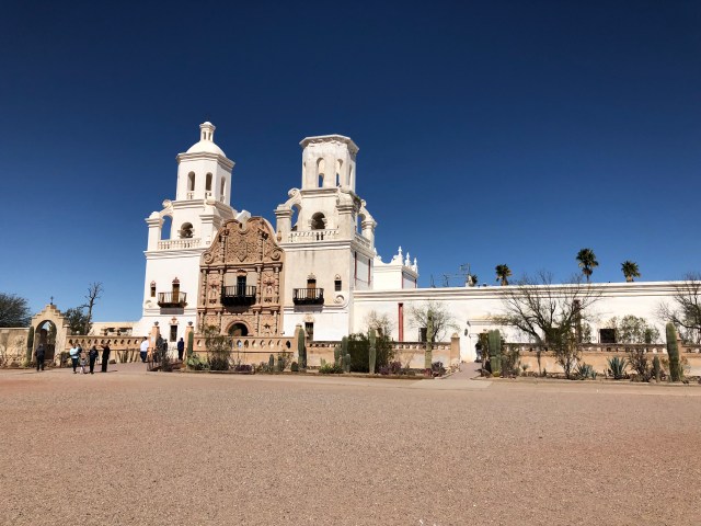 We gaan na het ontbijtbuffet eerst naar de missiepost, San Xavier del Bac Misson. Na een half uurtje rijden komen we hier om 11.15 uur aan. De San Xavier del Bac Mission is de oudste en best bewaarde missiekerk in het Zuidwesten. Hij rijst indrukwekkend en fel wit op in het vlakke en verlaten landschap. De missiepost is gebouwd van adobesteen. De huidige kerk is gebouwd in de jaren 1783-1797.