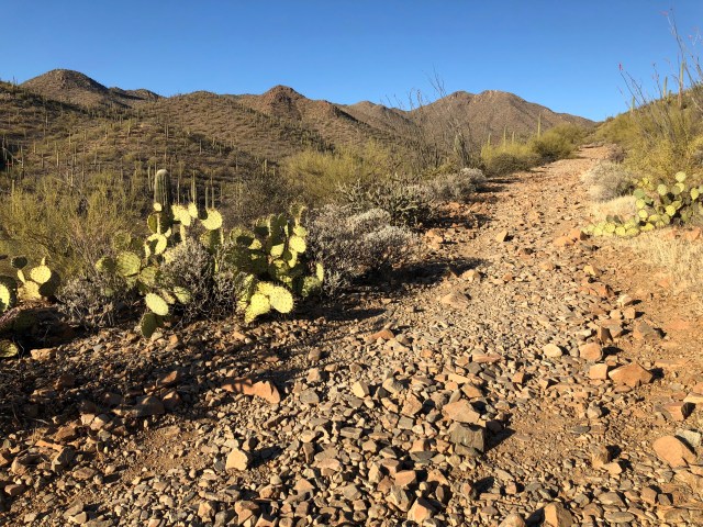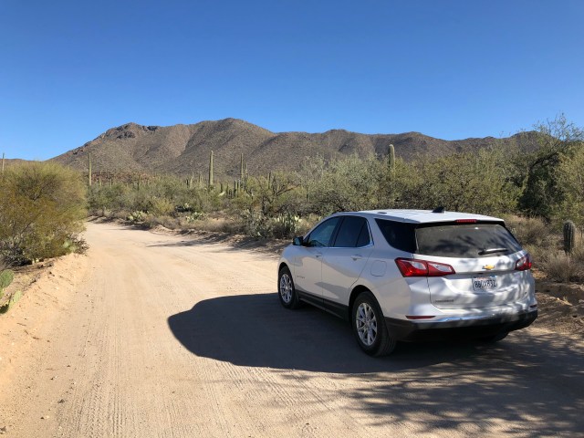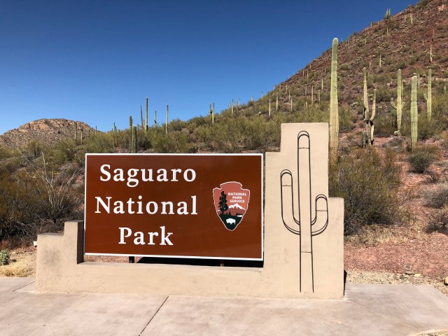 Uiteindelijk komen we om 14.00 uur aan bij het Visitor Center van het park. Hier kan men een kaart van de omgeving krijgen en vragen stellen aan medewerkers van het Visitor Center. We bekijken in het theater een 15 minuten durende film over dit park. De entree van het park bedraagt 15 dollar. We rijden een deel van de 6 mijl lange Scenic Bajada Loop Drive. De weg is onverhard en niet echt fijn om te rijden. We rijden tussen de Saguaro cactussen door. Dat is wel apart.