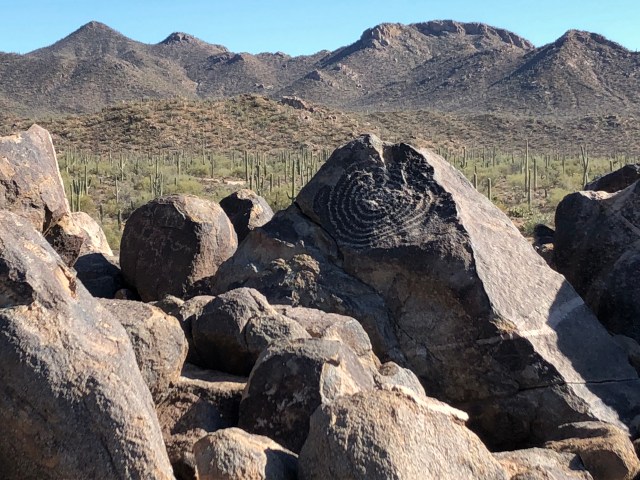 We parkeren de auto bij de Signal Hill trail. Hier lopen we naar een heuvel waar je van vroegere inwoners tekeningen uit de Prehistorie op stenen kunt vinden.