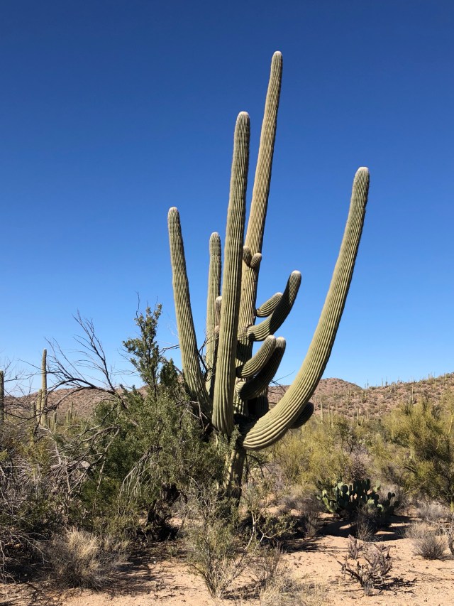 Saguaro National Park West. De veelarmige saguaro-cactus is het symbool van de staat Arizona. Het is de grootste en een van de langzaamst groeiende van alle cactussoorten.