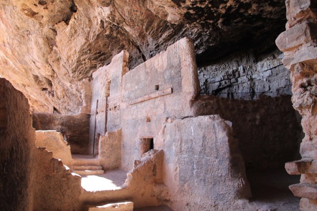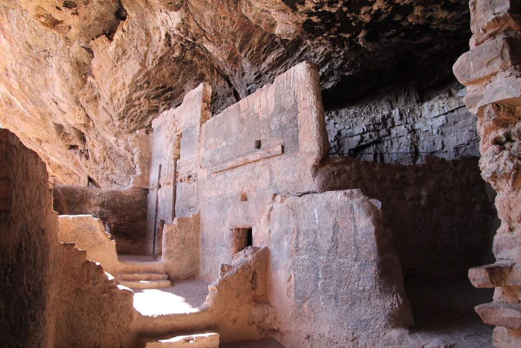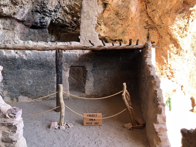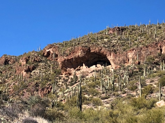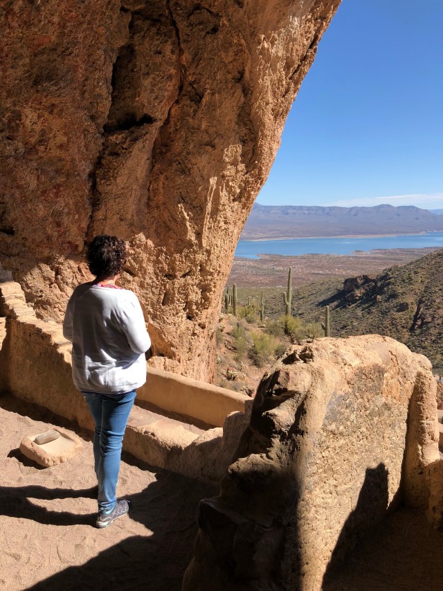 We stoppen bij het Tonto National Monument. In dit park liggen resten van twee goed bewaarde rotswoningen van de Salado Indianen. Deze leefden hier in de 13e, 14e en het begin van de 15e eeuw. Dit waren agrariërs die hun voedsel kweekten in de vallei van de Salt River. Er is een Lower Ruin en een Upper Ruin. Ze liggen hoog tegen de bergen op. We lopen naar de Lower Ruin. Na het ontbijt volgt de flinke 800 meter klim omhoog naar de rotswoning. In 10 minuten zijn we boven. We bekijken de rotswoning. Het uitzicht vanaf boven is prachtig. Diverse cactussen zoals de Saguaro domineren het landschap hier.