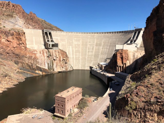 Om 11.45 verlaten we Tonto National monument. We stoppen even later bij 2 uitzichtpunten, 1 op de brug bij Roosevelt Lake en de andere bij de Roosevelt stuwdam. Tussen 1905 en 1911 is de Theodore Roosevelt stuwdam aangelegd. Door de bouw is Roosevelt Lake ontstaan. Het grootste meer in de staat Arizona.