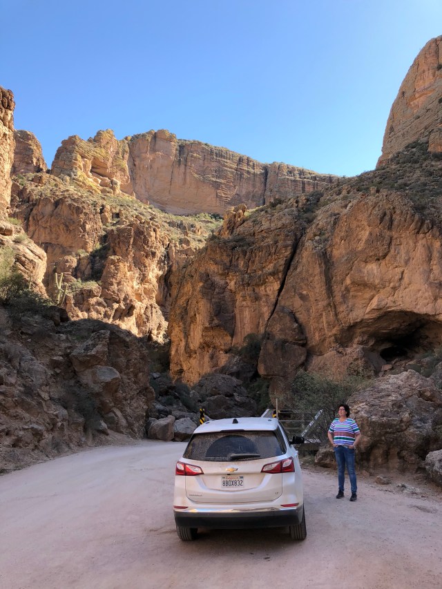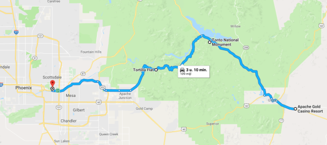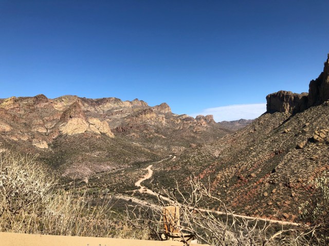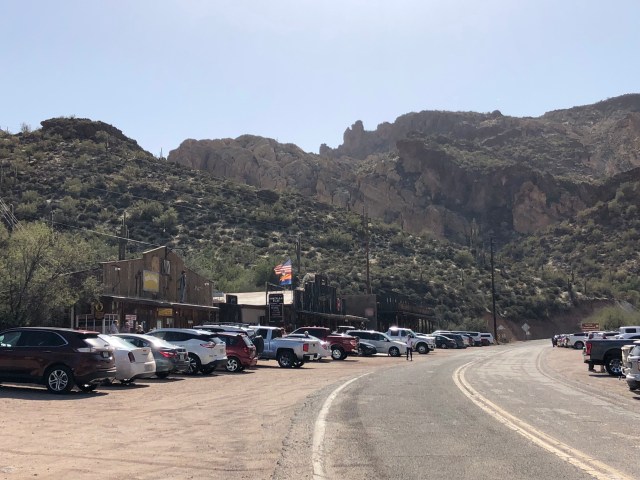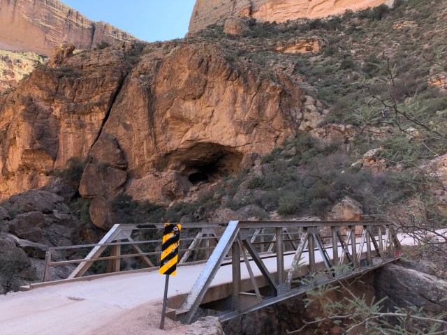 Het eerste stuk tot aan het plaatsje Tortilla Flat is van gravel. Veel harder dan tussen de 20 en 40 km/uur kun je er niet rijden. Soms is de weg wat hobbelig en er zitten een paar flinke haarspeldbochten in. Op bepaalde plekken passeer je bruggetjes waar maar 1 auto tegelijkertijd over heen kan.