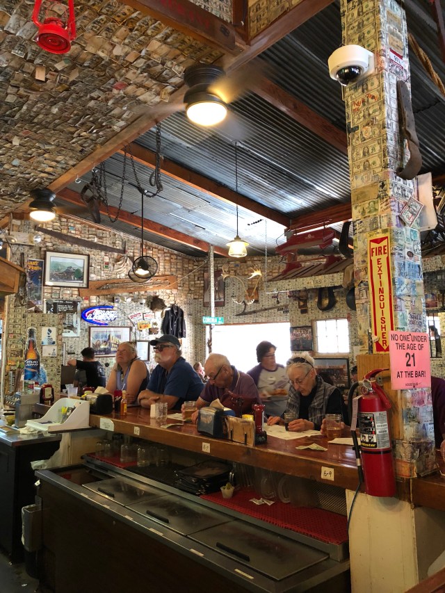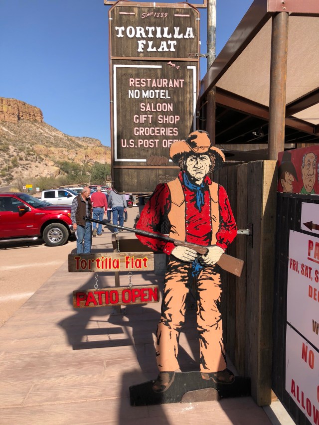 Vlak voor het plaatsje Tortilla Flat is de weg weer geasfalteerd. Onderweg wordt er nog wel wat aan de weg gewerkt, maar daar hebben we nagenoeg geen last van. Na 2 uur rijden over het stuk gravel en regelmatig stoppen om te genieten van de mooie uitzichten komen we aan in Tortilla Flat. Een klein oud western stadje. Vroeger kwamen hier de Apache indianen en goudzoekers langs om te bivakkeren. Nu is het erg toeristisch. Het is erg druk. Buiten in de patio wordt livemuziek gespeeld. We lopen nog even de Superstition Saloon binnen waar het druk is. We kijken even rond. De wanden zijn bekleed met gesigneerde dollarbiljetten. Grappig om te zien. We gaan naar buiten en kopen in het winkeltje ernaast een ijsje. 3 kwartier later vervolgen we ons weg via de Apache Trail richting Phoenix.