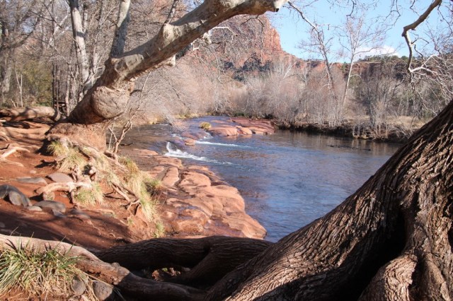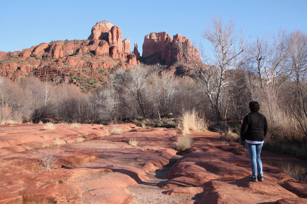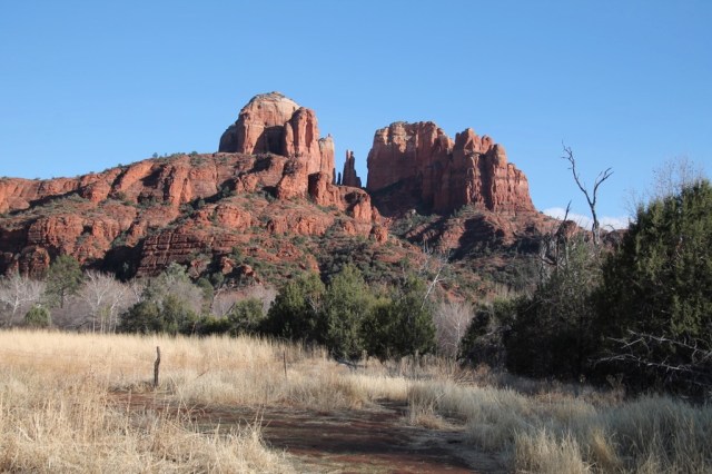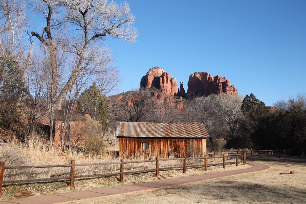 Bij Crescent Moon Ranch parkeren we de auto en wandelen naar het riviertje de Oak Creek. Vandaar heb je een prachtig uitzicht op Cathedral. De kleine rotsformatie midden tussen de 2 grotere rotsformaties lijkt op een kathedraal.