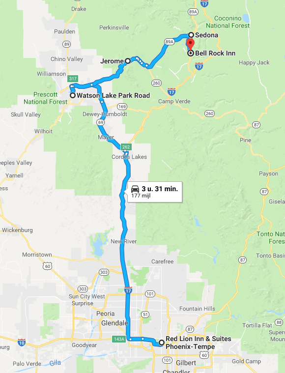 Inmiddels is het donker en we rijden nog 15 minuten naar ons verblijf deze nacht, Bell Rock Inn. Het hotel ligt in Oak Creek. We checken om half 8 in.