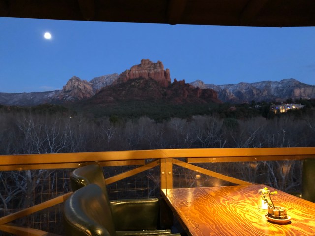 Het is druk want de zonsondergang is rond 18.15. Wij kijken even en rijden terug naar Sedona. We tanken de auto en gaan daarna om 18.00 uur eten bij Hideaway House. Daar gaan we buiten op de patio zitten. Er is een heater en dekens om niet koud te worden. We kunnen hier tijdens het eten genieten van de zonsondergang met een volle maan in Sedona.