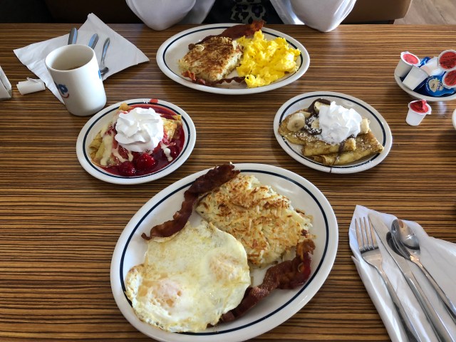 We gaan vanmorgen ontbijten bij IHop. Hier kun je goed ontbijten voor een redelijke prijs. We nemen een menu met kleine pannekoekjes, ei, bacon en hash browns. Hash Browns is een soort geraspte gebakken aardappel.