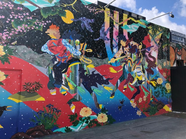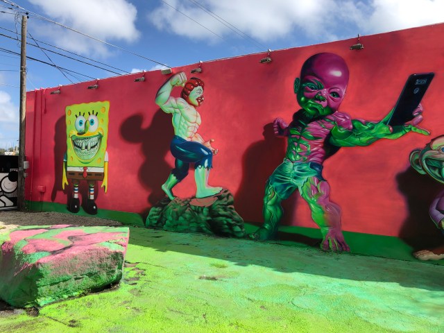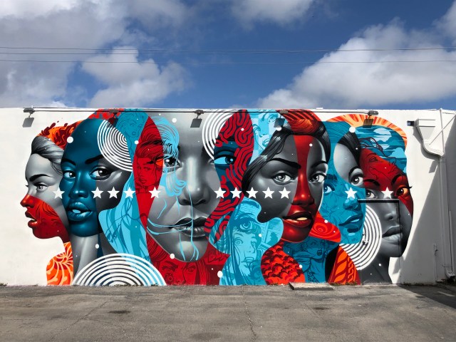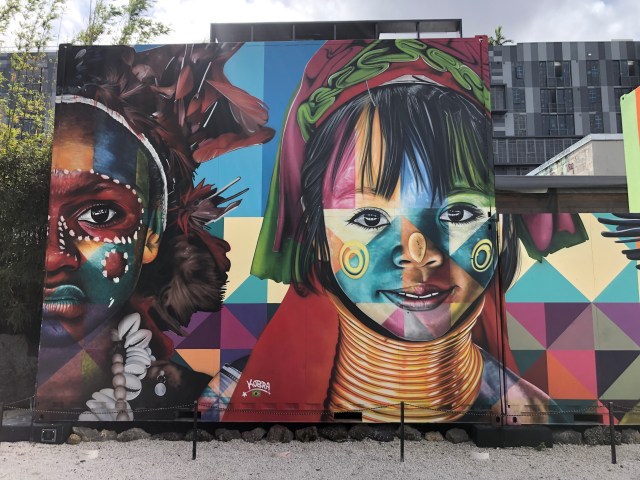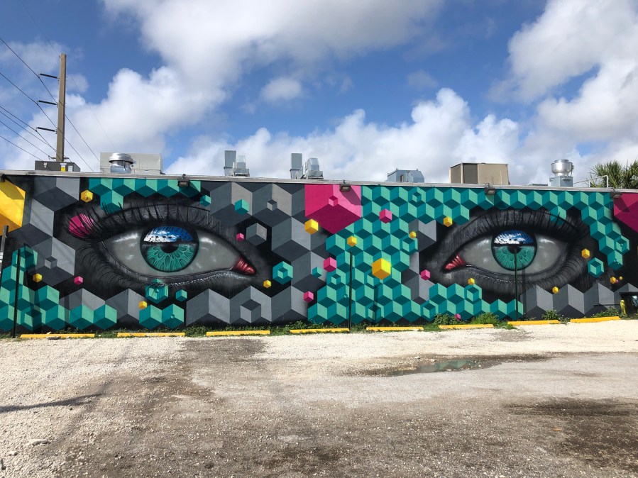 Na het eten rijden we via North Bay Village naar de wijk Wynwood. Alles in deze wijk draait om straatkunst. Veel muren van voormalige warenhuizen in de straten van deze wijk zijn beschildert met graffiti. In het centrum van de wijk ligt achter een zwart hek de Wynwood Walls. Vanaf 2009 gingen de eerste artiesten hier aan de slag om prachtige muurschilderingen te maken.