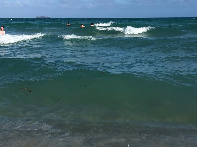 Tegen 14.00 uur zijn we terug bij het hotel. We doen onze zwemkleding aan, smeren ons in met zonnebrand en lopen naar het strand. Bij marker 18 gaan we het strand op.
