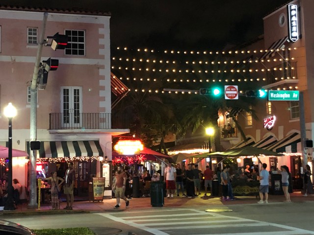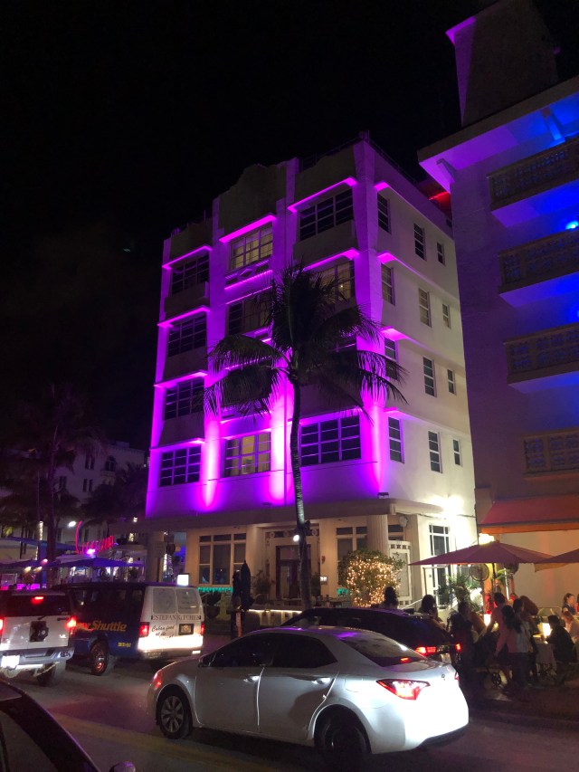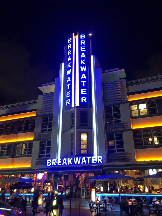 Het eten smaakt prima. Na het eten lopen we naar Ocean Drive om de mooi in de avond verlichte Art Deco gebouwen te bekijken.