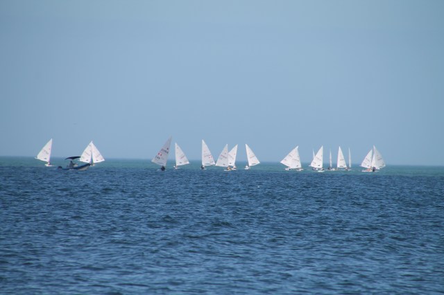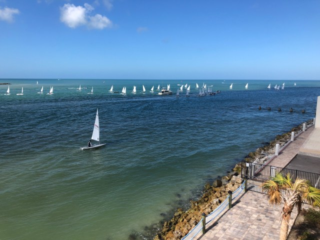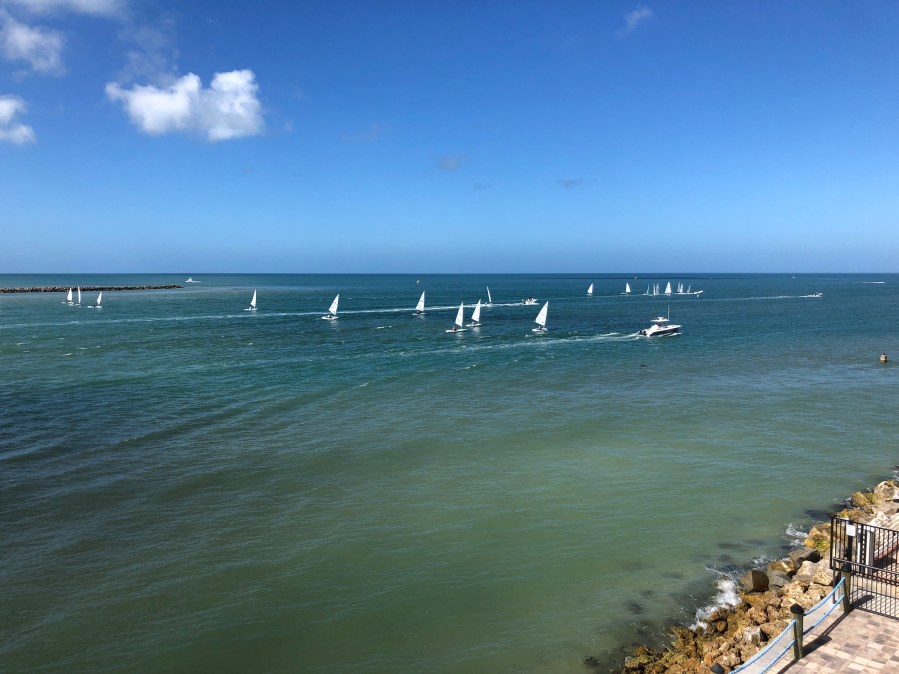 Vanuit de hotelkamer zien we hoe heel veel zeilbootjes langs ons hotel varen richting de zee. Waarschijnlijk een wedstrijd.