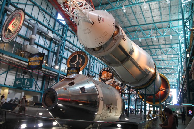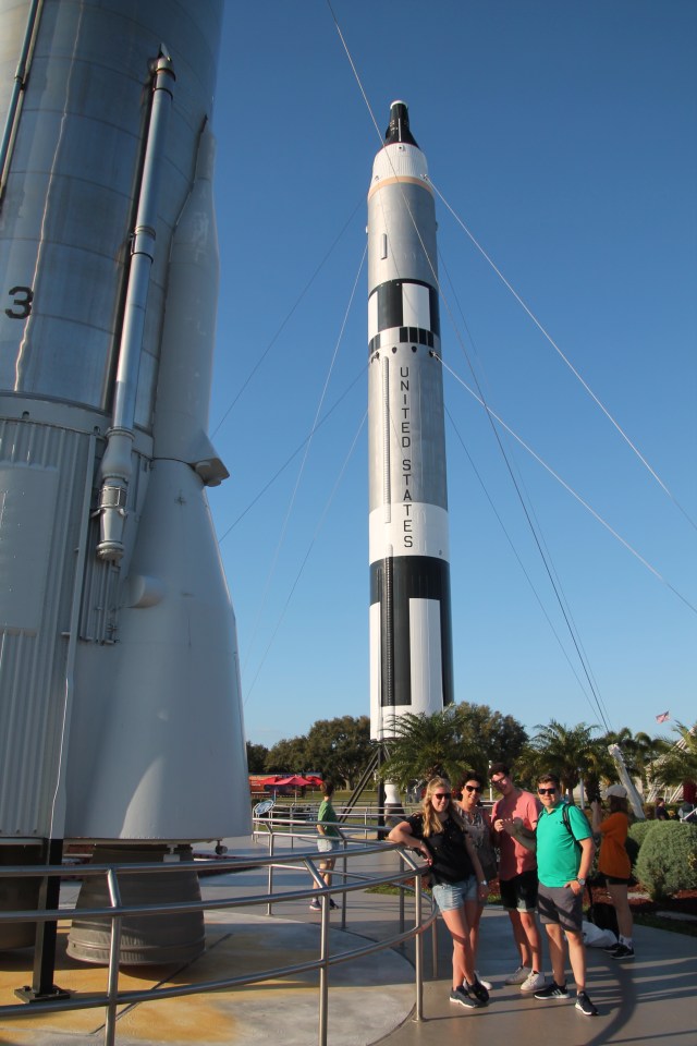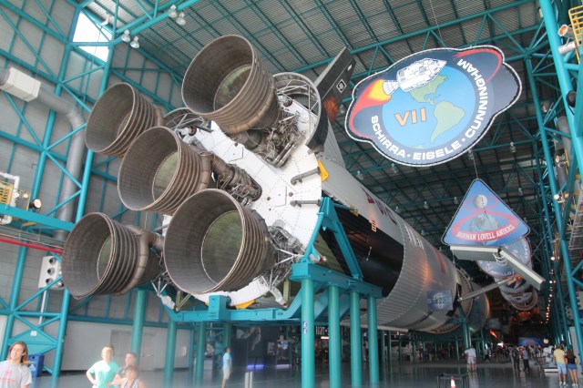 Halverwege de bustour stoppen we bij het bezoekerscentrum van de Saturn V. Bij aankomst krijgen we eerst een korte film te zien van hoe het allemaal is begonnen met het Saturn V/ Apollo programma. In een volgende zaal zien we de lancering van de Apollo 8 vanuit de controleruimte. Daarna komen we in we grote hal waar een van de nog nooit gelanceerde Saturn V rakket staat tentoongesteld