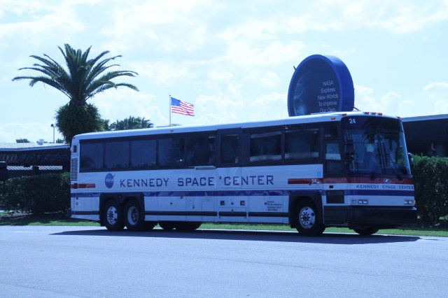 Het eerste wat we willen doen is een bustour langs o.a. de lanceerplatforms. We wachten ca. 10 minuten, waarna we de bus in kunnen. Onderweg vertelt de buschauffeur wat over de bezienswaardigheden onderweg en we krijgen ook videofilms te zien, waardoor we nog meer te weten komen over de lancering platforms etc.