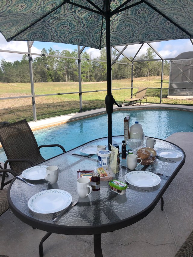 Om 10 uur gaan we ontbijten. Albert bakt pancakes en Rianne roostert broodjes. We zitten lekker buiten bij het zwembad.