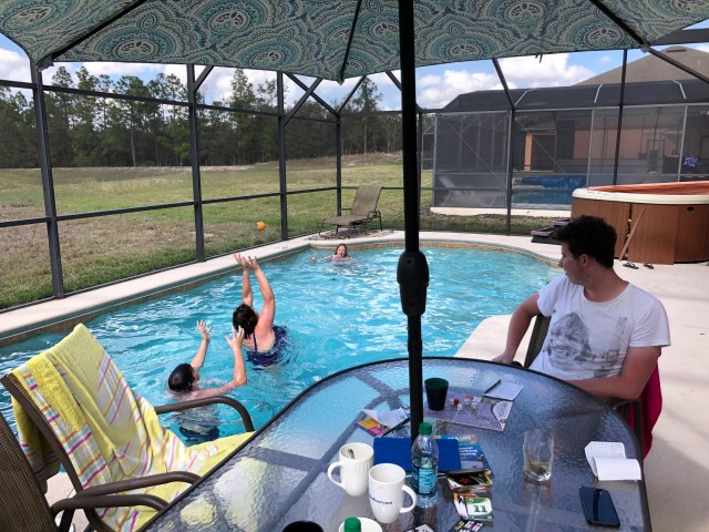 Na het eten doen we een spelletje, nemen een duik in het wel erg warme zwembad en doen tussendoor een potje poolbiljart.