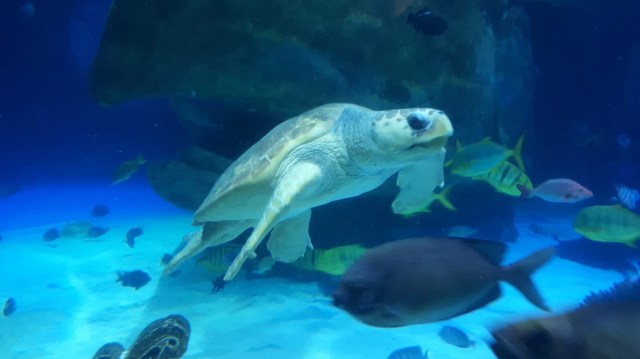 Het is nog bewolkt, maar wel al lekker warm. Rianne en Albert gaan met zijn tweeën naar Sea Life Aquarium. Om 14.00 uur hebben ze dat gezien.