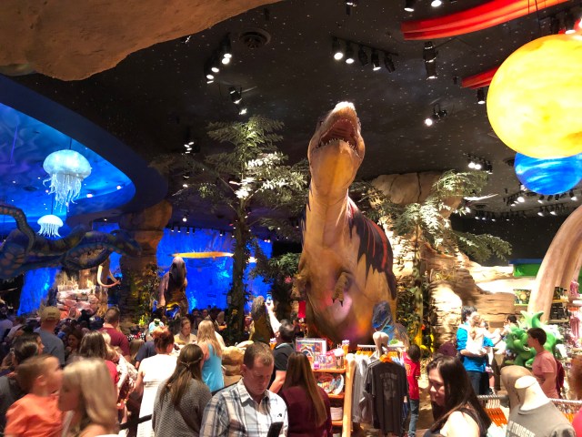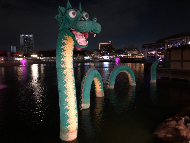 Na het eten lopen we langs de winkels en restaurants. Alles allemaal mooi verlicht. In het meer vlakbij de Legostore is het grote Loch Ness (Nessie) monster van Lego nagemaakt. Verder is er een T Rex restaurant , hier staat alles in het teken van de dinosauriërs. Je kunt eten tussen grote nagemaakte dino’s.