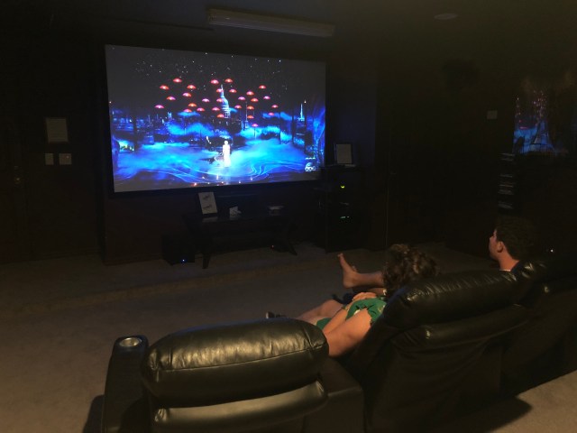 We zetten koffie en gaan in de villa live de Oscar uitreiking in de bioscoopzaal van onze villa bekijken.